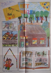 Links zie je mijn gepubliceerde opstel. Hieronder nog een keer het verhaal: De jongen die heel veel van huizen hield. Er was eens een jongen die heel veel van huizen hield. Hij heette Jantje en was 10 jaar. Hij had zoveel boeken waar huizen in stonden. Huizen die hij zelf kon bouwen en huizen die je kon eten. En op een dag ging hij naar de bibliotheek en zocht daar weer een boek waar huizen in stonden. Hij had er een gevonden en ging weer naar huis. Toen hij thuis was ging hij meteen naar zijn kamer om het boek te lezen. In het begin vond Jantje het al zo spannend dat hij er over wou dromen. Hij ging op zijn bed liggen en zette het boek open op zijn hoofd en ging dromen. Hij droomde dat hij in het huizenpaleis was. Er waren daar net zulke huizen als hij gelezen had. Er waren daar ook allemaal lieve en aardige mensen. De mensen leefden met de huizen mee. Dus als het ging omweren gingen de huizen stuk en de mensen gingen dood. En op een dag ging het ook omweren. Alle mensen en kinderen gingen dood. En Jantje bleef alleen achter. Opeens kwam er daar een fee. Ze zei tegen Jantje: 'Jantje je hoeft echt niet bang te zijn hoor. Want als je weer met die kinderen wilt spelen moet je iets doen. Maar je kunt het alleen, als je het echt wilt.' 'Ja dat wil ik wel.' zei Jantje huilend. De fee zei: 'Je moet de tovenaar zoeken. Hij woont daar helemaal achter die bergen. Je komt ergens en moet dan over een hele grote vijver springen. De stroom is heel hard. Daarna moet je over een hele gladde berg lopen, maar je kunt niet over de berg lopen het is te glad. Je hebt vleugels nodig!' 'Maar hoe krijg ik dan vleugels?' zei Jantje. De fee zei: 'Als je over het hele grote meer bent gesprongen, krijg je vleugels! Doe je best!' Jantje liep weken en dagen en en hij was bij het grote meer. Hij nam een grote aanloop en sprong. Het lukte! Jantje kreeg vleugels en vloog. Hij vloog over de grote bergen daar zag hij alle huizen mensen kinderen en huizen weer. Hij speelde weer met de kinderen en toen werd Jantje weer wakker. Hij zei: 'Wat heb ik een leuke droom gehad!'